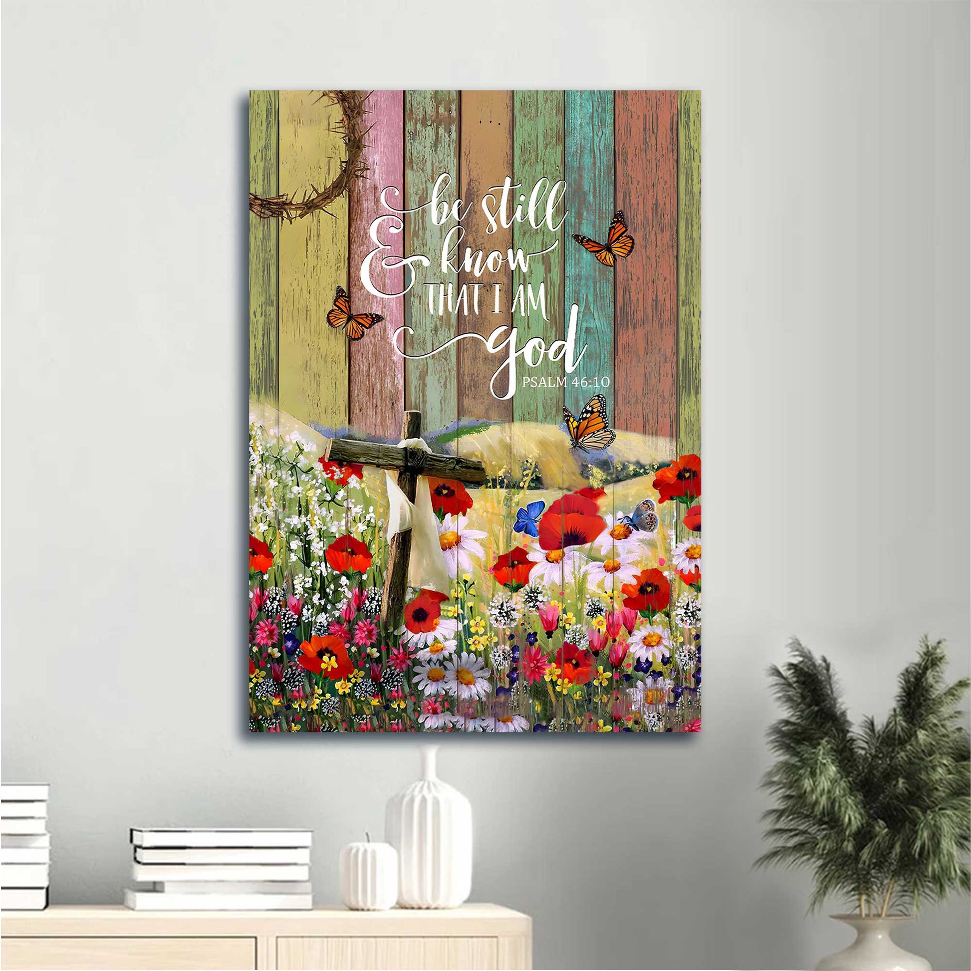 Jesus Portrait Canvas - Wooden Cross, Flower Field, Butterfly Canvas - Gift For Christian - Be Still And Know That I Am God Canvas