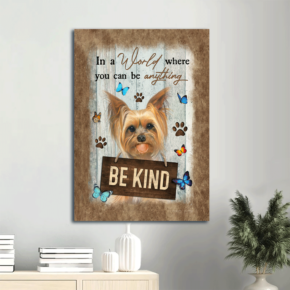 This amazing Yorkshire Terrier Portrait Canvas- Cute Yorkie, Blue butterfly canvas- Gift for Yorkshire Terrier lover- In a world where you can be anything is the perfect present for family members, friends or people who love dogs. Besides, the wall art is suited for any room in the house from the living room, bedroom and kitchen to even the entryway.